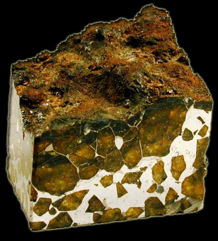 Morceau coupé, en forme de bloc, de pallasite, météorite mixte pierre/métal (principalement fer/nickel), trouvée en