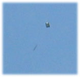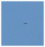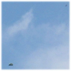 Un fort agrandissement du cliché n°4 fais penser à un ballon, genre météo, car en dessous et légèrement a gauche de l'objet semble traîner un sorte de "nacelle", mais sur le cliché n°1 prit moins de deux minutes avant, une "trace noire" similaire se trouve complètement au dessus , à droite, et nettement plus loin de l'objet, ce qui pourrait laisser à supposer de fortes rafales de vent , (pas le cas ce jour là),ou à un artéfact ( par ex : oiseau, on a sur ce même cliché,une autre trace , découvert à l'analyse des photos sur écran , peut être aussi un oiseau flouté par la pixellisations?(en bas à droite)) ; de plus aucune trace visible de cette traînée sur les photos n°2 et 3 . A noter, -1/ L'objet était suffisamment brillant pour me "tirer" l'oeil a une distance qui est, d'après moi, de l'ordre de 1500 à 2500 m. - 2/ Les sondes météo ou autres ne sont pas courantes dans le périmètre : aéroclub situé à moins de 3500 mètres , coté sud, base aérienne de l'armée (Mirage2000) à 10 km coté sud-ouest .- 3/ L'objet n'avait pas une forme sphérique ,mais plutôt une forme de "coussin ovoïde". |